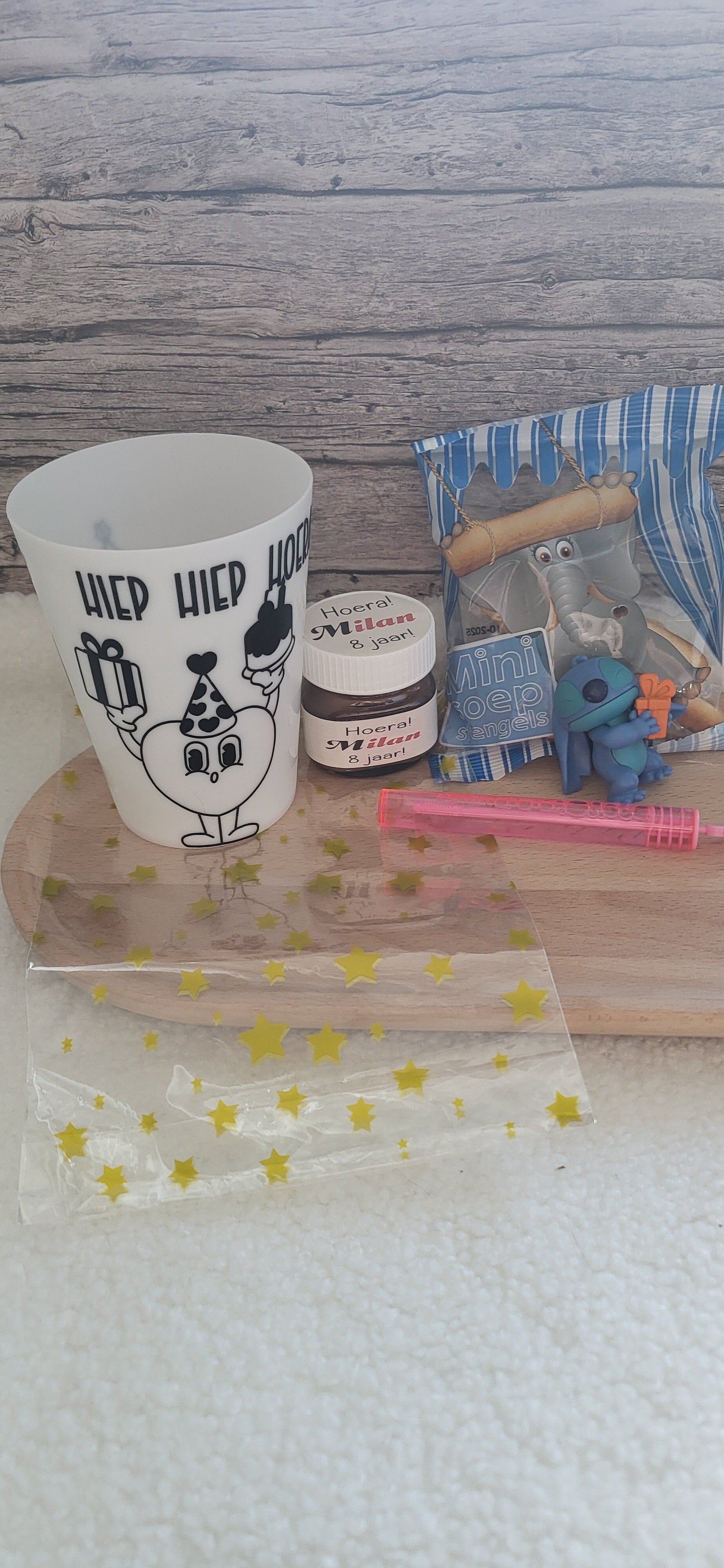 Plastic drinkbeker gevuld met soepstengels, een potje Nutella hazelnootpasta en een willekeurig speeltje na keuze.